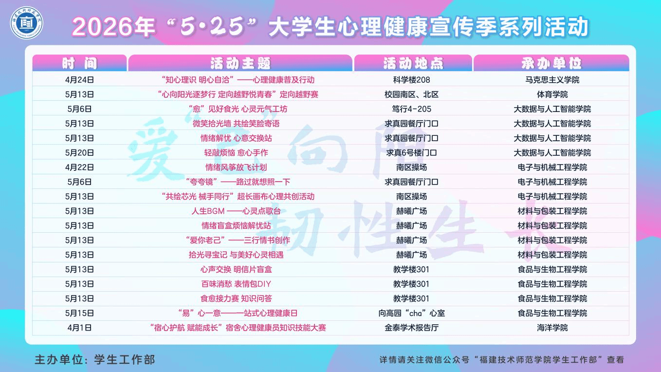 别担心,本次大学生心理健康宣传季,为你打造专属心灵栖息地:在这里,你可以放心倾诉心声,卸下内心重负;可以尽情放松身心,找回松弛状态;更能与温暖相遇,与自己和解。