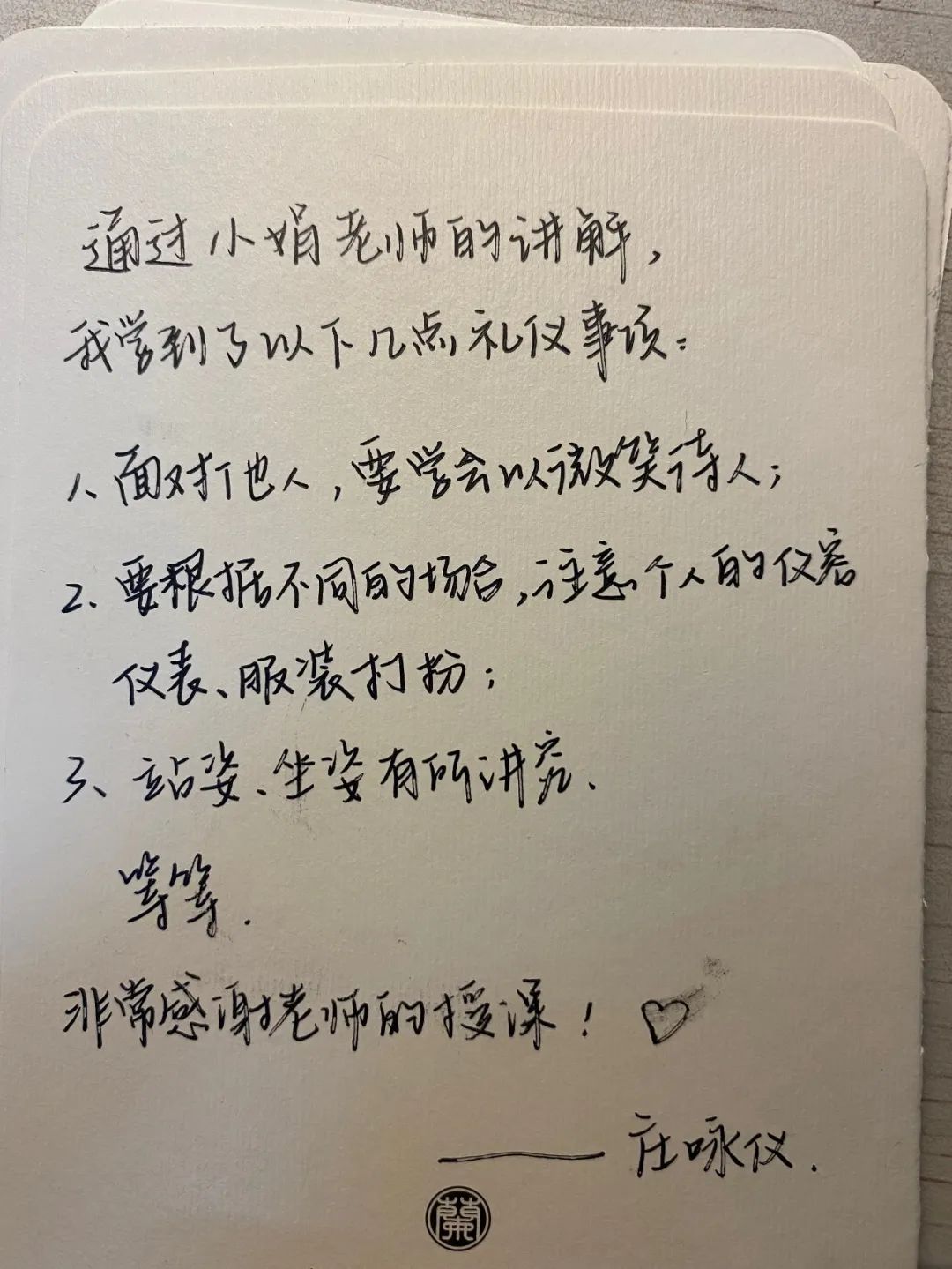 接着是沟通礼仪。小娟老师教会同学们文明用语十字经“请、您好、谢谢、对不起、再见”,并为同学们演示用语时的正确姿势。语言和动作相结合,生动形象。