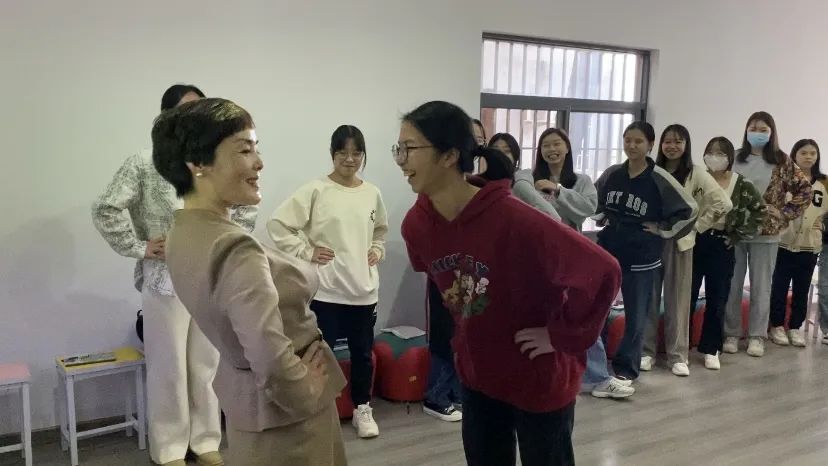 活动开始,小娟老师请大家起立,随着“骑上我的小摩托,带你去看日不落…”欢快律动的音乐响起,同学们跟着老师的口令,模仿老师的动作:抖抖左肩,抖抖右肩,向前抖抖,向后抖抖。大家都玩得不亦乐乎,一扫下午听课的疲惫困倦,气氛瞬间变得轻松愉悦起来。小小的耸肩操热身活动后,老师又引导大家与左右同学相互握手,相互微笑,熟悉对方。