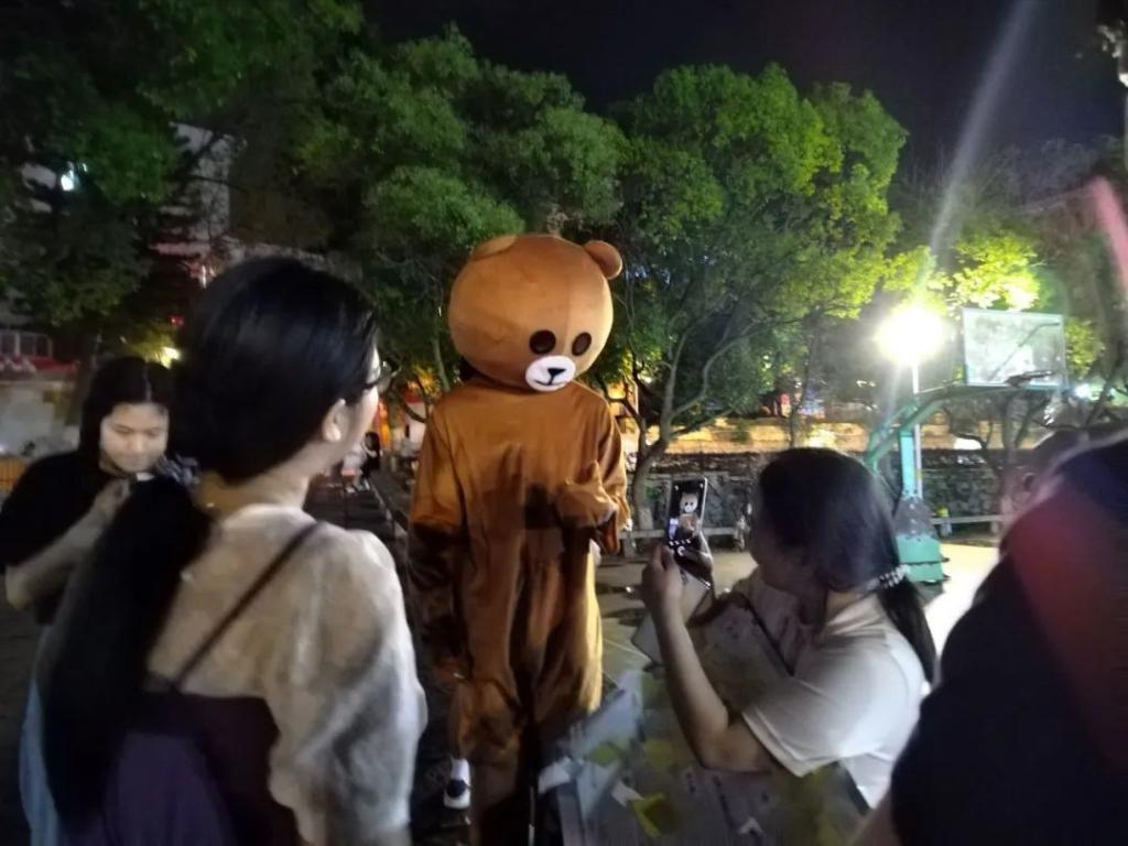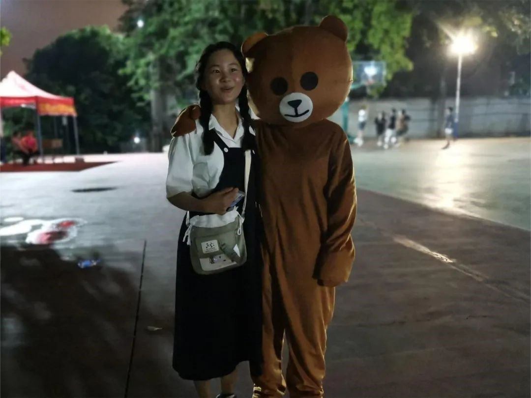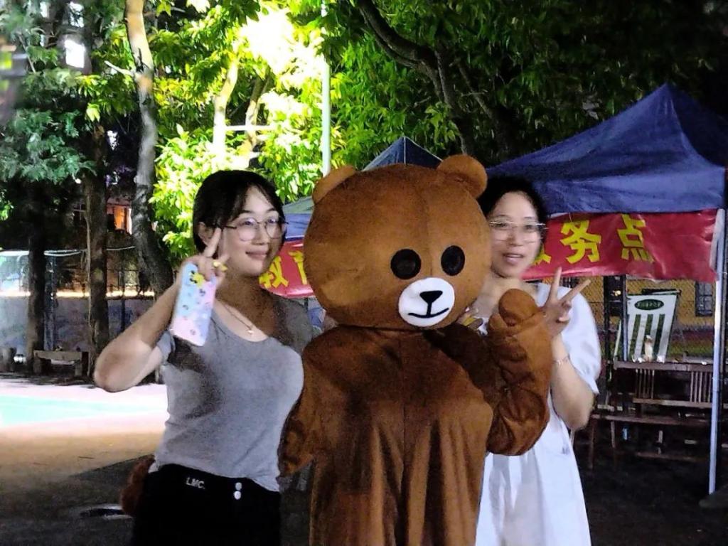 心理健康教育咨询中心的工作人员身穿可爱的玩偶服与同学们热情地打招呼并拥抱,现场氛围温馨热闹。