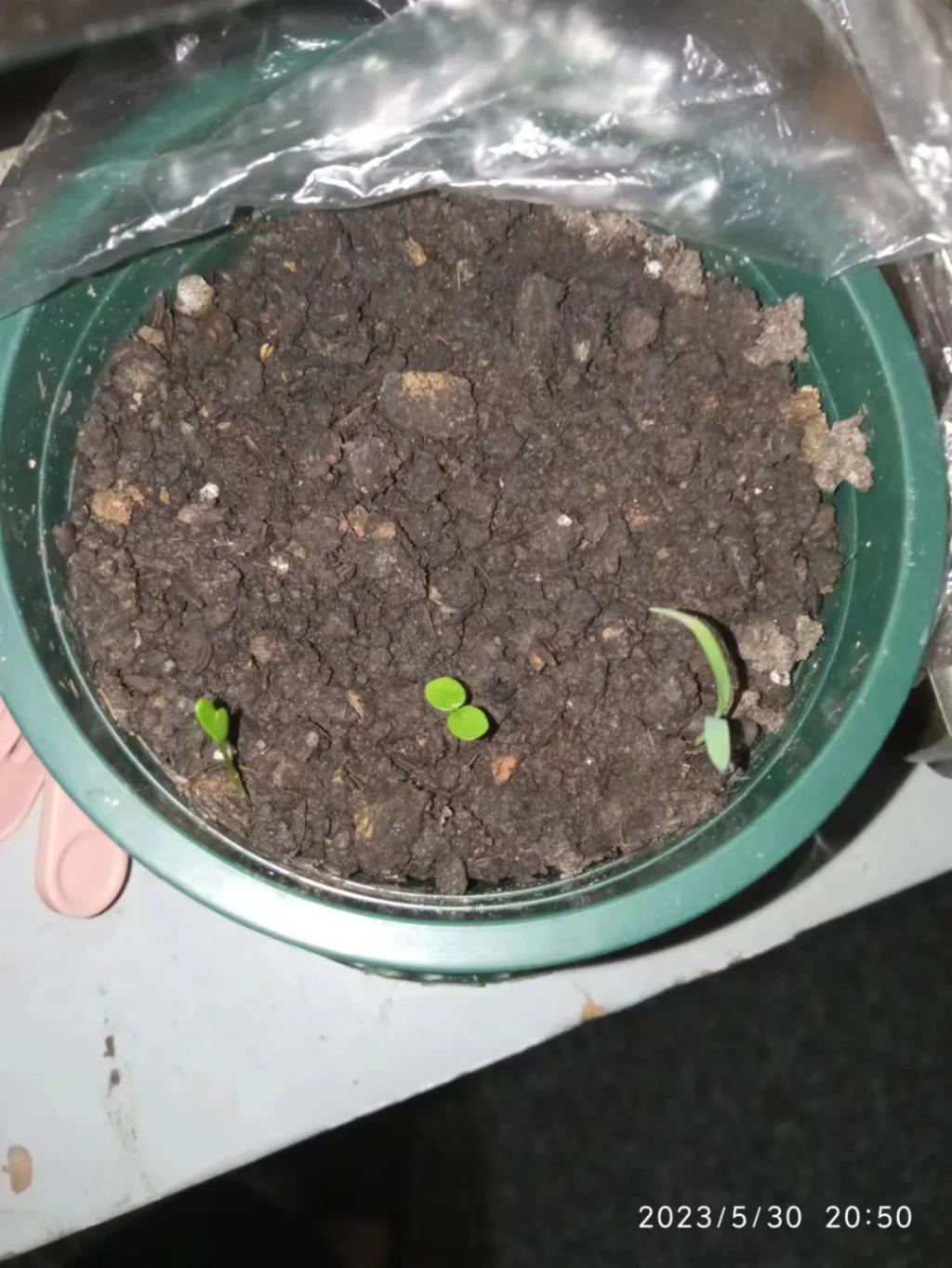 5月20日今天晚上非常开心,带着你们回到宿舍。看到你们既激动却又手足无措,我不知道怎么养护你们。根据网上学习到的,便开始松土,把你们洒上去并慢慢地浇水,还找了一个垃圾袋把整个花盆套住。心里暗暗期盼你们要快快长大。