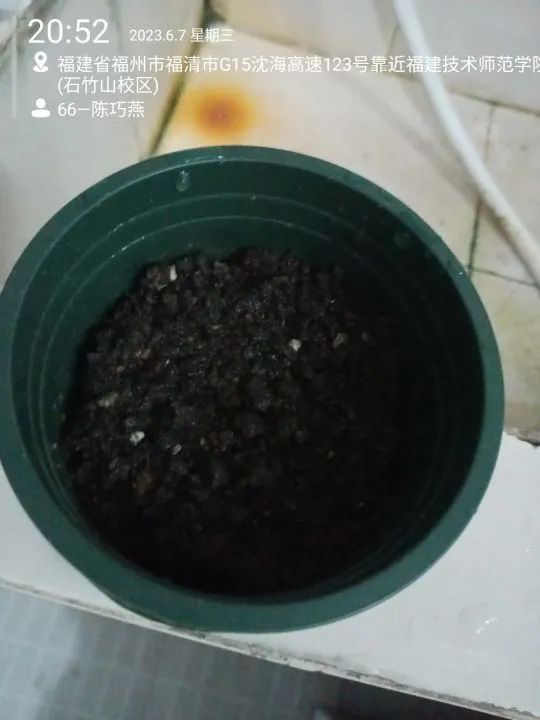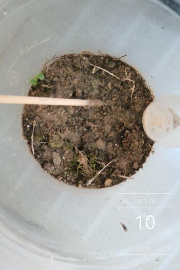 5月20日这是好日子,种子被我带了回去,可是好小的种子,比芝麻还小,能长出来?5月21日晚上,趁着夜黑,我和舍友带着碗勺筷去校园内找了个地方刨土(后续反思:应该戴个口罩再去刨土。)虽然咱没小花盆,也没营养土,但是土是我亲手刨的,为了让土更有营养,还特意刨了一些青苔垫在土下沤肥。有盆,有土,种子有家了,我把袋子一翻,种子全掉进去了。嗯?看不见种子,在灯光下瞅瞅,还是有的,在土面上,种子应该在土里,所以用筷子搅拌了下,再看,看不见种子,它们安然进入新家了。