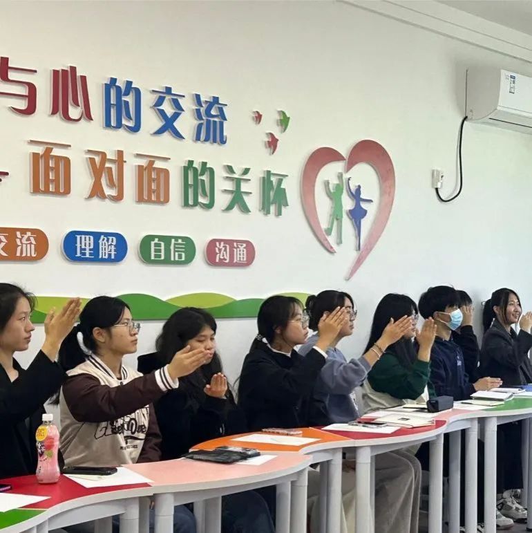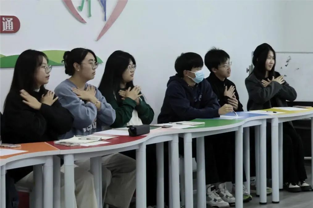 活动伊始,杨老师请同学们起立,带领大家学习一小段手势舞。同学们在欢快律动的音乐中跟着口令,模仿着老师的动作:挥挥手、比比心、耸耸肩、最后双手比爱心,将爱送出去。在这个过程中,现场的气氛逐渐活跃起来。小小的手势舞热身活动结束后,老师又引导大家与邻近的同学相互握手,相互微笑,彼此熟悉。