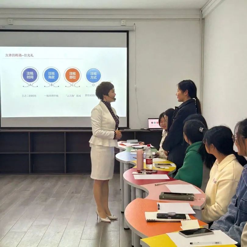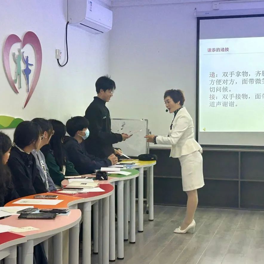 在沟通礼仪方面,杨老师先教大家如何正确使用文明用语,如“请、您好、谢谢、对不起、再见”等,并为同学们演示在使用这些用语时对应的姿势。