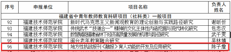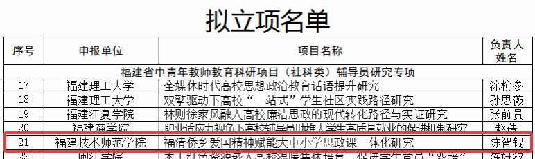 福建省教育厅公示2025年度福建省教育系统哲学社会科学研究项目拟立项名单,我校海洋学院辅导员陈智锟、艺术与传媒学院辅导员陈子詹申报的项目成功入选,充分体现了我校辅导员“以研促育、以研提质”的专业素养与追求。