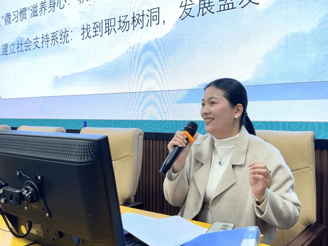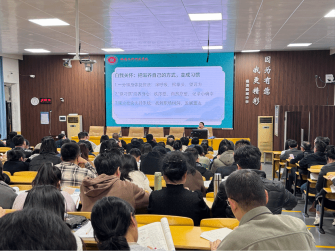 讲座以“先安顿自己,再照亮他人”为主线。郑明娟老师结合情绪ABC理论、费斯汀格法则等心理学理论,引导教师科学识别与转换工作中的不合理信念,并现场传授了“一分钟身体复位”、“记录小确幸”等便于操作的自我关怀技巧。